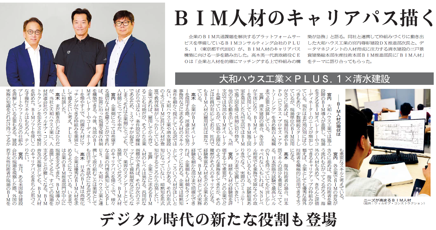 日刊建設通信新聞関西建設ICT特集号(11月29日発刊)に掲載されました。日本のBIMを担う人材導入・育成の重要性について、大和ハウス工業様×清水建設様×PLUS.1 の対談形式でインタビュー頂いております。
